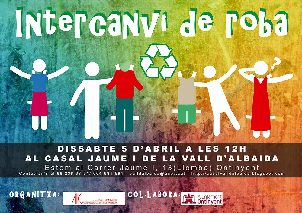 Dissabte 5 d'abril a les 12h al Casal de la Vall d'Albaida sessió d'intercanvi de roba. Renovarem els nostres armaris sense despesa alguna i a més contribuint a la reutilització de les peces de roba i per tant afavorint la conservació del nostre entorn.