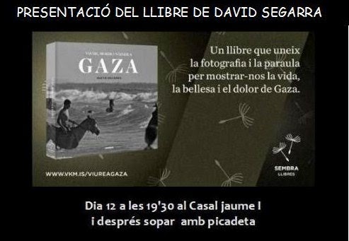 Divendres 12 de desembre, a les 19.30h al Casal Jaume I del Camp de Túria. Presentació del llibre 'Gaza' de David Segarra, després picadeta i sopar.