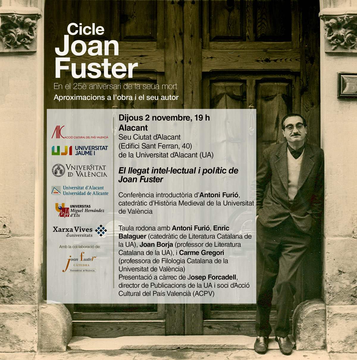 Enguany commemorem el 25è aniversari de la mort de Joan Fuster. L’aniversari és important, perquè l’autor de Sueca és sens dubte un dels valencians més importants de la segona meitat del segle XX, amb una obra ingent, que contempla diversos gèneres (poesia, assaig, història de la literatura, estudis culturals, periodisme…), i que ha tingut i té una influència indubtable en els més diversos àmbits. Però en el nostre cas és un aniversari molt especial, perquè no podem oblidar que Joan Fuster fou un dels membres fundadors de la nostra entitat i el primer president d’Acció Cultural del País Valencià (ACPV).