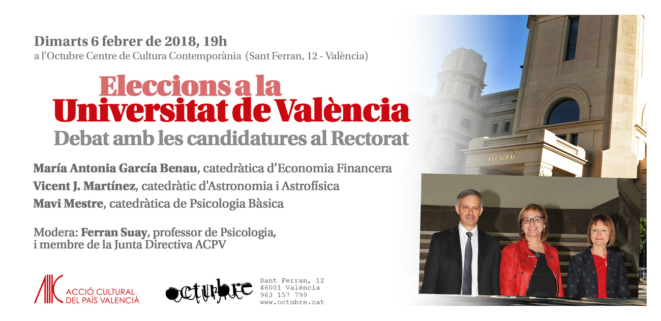 Acció Cultural del País Valencià (ACPV) ha convidat les tres candidatures que concorren a les pròximes eleccions al Rectorat de la Universitat de València a presentar públicament el seu projecte d’Universitat i a debatre’l. L’acte tindrà lloc el pròxim dimarts 6 de febrer, a les 19 h, a la nostra seu central, l’edifici Octubre Centre de Cultura Contemporània (OCCC, al carrer de Sant Ferran, 12, de València).