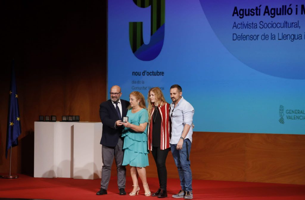 Agustí Agulló i Marcos, que va estar delegat d’ACPV al Baix Vinalopó, va estar condecorat ahir 9 d’Octubre amb un guardó en reconeixement al seu activisme en favor de la nostra identitat i de la nostra llengua. La seua família l’arreplegà al Gran Teatre d’Elx.
