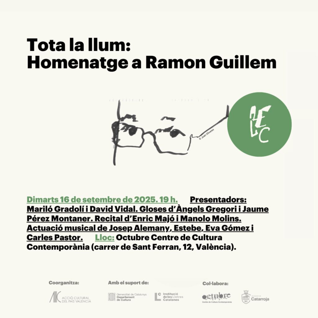 Acció Cultural del País Valencià coorganitza amb l’Associació d’Escriptors en Llengua Catalana “Tota la llum”, un homenatge a Ramon Guillem, poeta, narrador i assagista reconegut, dijous 16 de setembre al l’Octubre CCC.