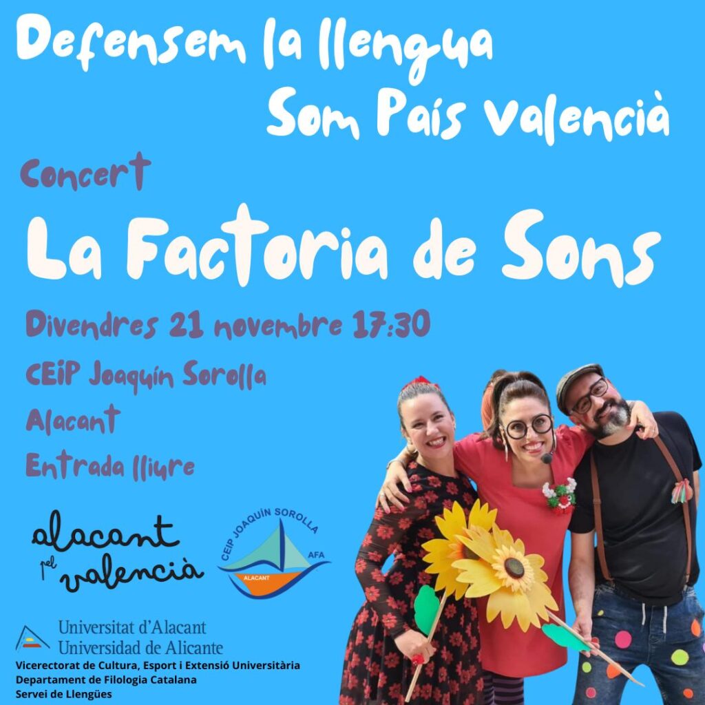 • Divendres 21, a les 19.00 h – Concert al CEIP Joaquín Sorolla: Actuació de La Factoria de Sons, el projecte de musica familiar encapçalat per l’Aitana Ferrer.
