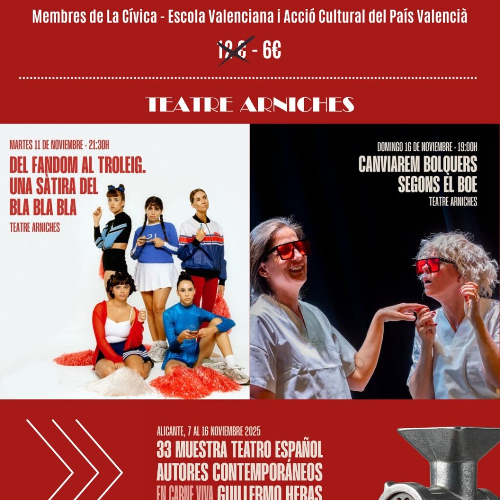 Aquest novembre, el Teatre Arniches d’Alacant es converteix en un escenari privilegiat per a la promoció de la cultura en valencià, gràcies a una iniciativa que farà les delícies dels amants del teatre. Els socis i sòcies d’Acció Cultural del País Valencià (ACPV) podran gaudir d’un descompte del 50% en dues propostes escèniques que prometen fer pensar, riure i emocionar.