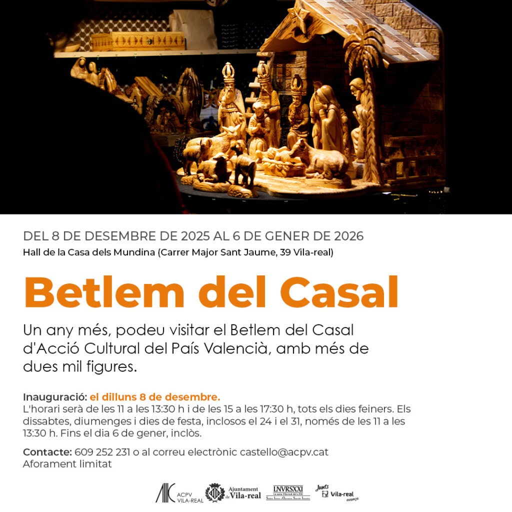 Un any més, Acció Cultural del País Valencià presenta el seu tradicional Betlem del Casal, una de les propostes nadalenques més estimades per la ciutadania de Vila-real i de les comarques de la Plana. En aquesta edició, però, hi ha una novetat important que volem destacar: enguany el betlem canvia d’ubicació. Per motius d’espai i per a garantir una millor experiència de visita, l’exposició no se celebrarà al Casal d’ACPV com és habitual, sinó que es trasllada al Hall de la Casa dels Mundina (Carrer Major Sant Jaume, 39 · Vila-real). Un espai més ampli i accessible, que permetrà contemplar amb més comoditat el muntatge.