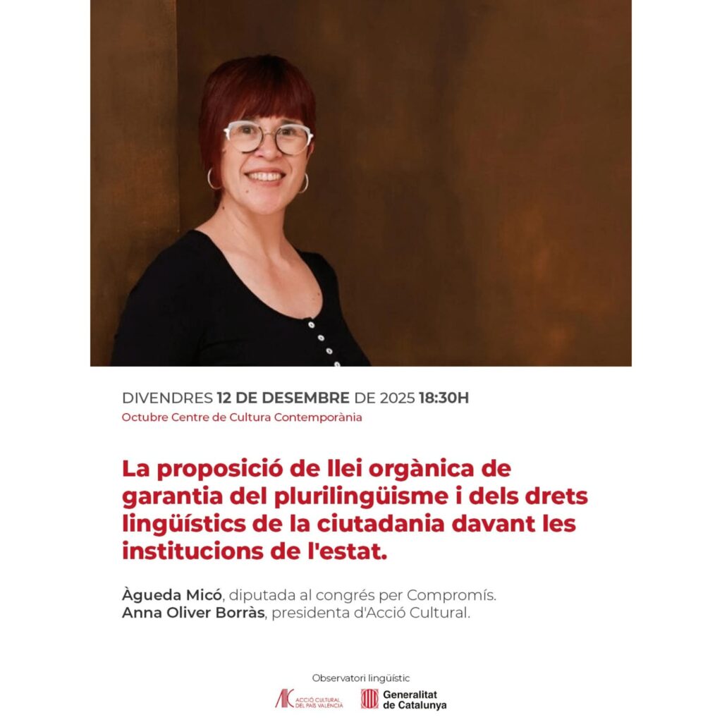 El pròxim divendres 12 de desembre de 2025, a les 18.30 h, l’Octubre Centre de Cultura Contemporània (València) serà l’escenari d’una sessió dedicada a analitzar la proposició de llei orgànica de garantia del plurilingüisme i dels drets lingüístics de la ciutadania davant les institucions de l’Estat.