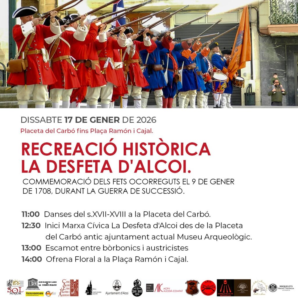 La marxa s’iniciarà a les 12:30 h de la Placeta del Carbó antic ajuntament de la vil·la d’Alcoi i actual museu arqueològic, on prèviament podrem gaudir de danses del s. XVII -XVIII a la Placeta del Carbó des de les 11:00 del matí, a càrrec del grup de danses Sant Jordi i Amigues i Amics de les danses tradicionals Dansaires d’Horta Major. En aquest acte comptarem amb la participació de l’AC Miquelets del Regne de València, Miquelets de Catalunya, Règim Anglés dels Redcoats, “Asociación Cultural y Recreación historica batalla de Almansa”, Grup de danses Sant Jordi, Amigues i Amics de les danses tradicionals Dansaires d’Horta Major, la colla de dolçainers i tabaleters Sol Major, Grup de dolçainers i tabaleters Estrela roja de Benimaclet i la Colla de Campaners d’Alcoi, que ens oferirà un toc d’alarma com requereix l’ocasió des del campanar de la parròquia de Santa Maria.