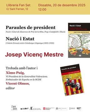 Aquest dissabte 20 de desembre de 2025, a les 12:00 hores, tindrà lloc a la Llibreria Fan Set la presentació dels llibres “Nació i Estat” i “Paraules del President”, de l’historiador i professor Josep Vicenç Mestre.