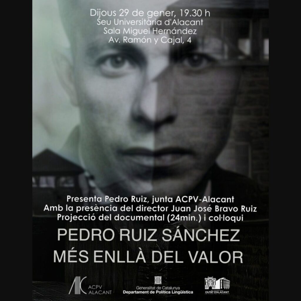 El dijous 29 de gener de 2026, a les 19.30 h, la sala Miguel Hernández de la Seu Universitària d’Alacant acollirà una nova proposta cultural que convida a la reflexió, la memòria i el diàleg crític. L’acte, organitzat per ACPV d’Alacant, consistirà en la projecció del curtmetratge Pedro Ruiz Sánchez. Més enllà del valor, una peça audiovisual que recupera la figura d’un personatge singular i representatiu d’una època marcada per la lluita, la dignitat i el compromís cívic. La sessió comptarà amb la presència del director, Juan José Bravo Ruiz, que participarà en un col·loqui posterior amb el públic.