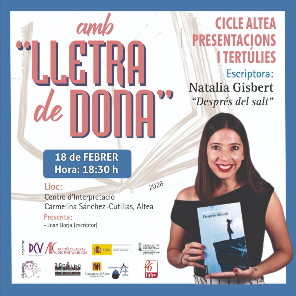 El pròxim 18 de febrer, a les 18.30 hores, el Centre d’Interpretació Carmela Sánchez-Cutillas d’Altea serà l’escenari d’una nova cita del cicle Amb Lletra de Dona, una iniciativa cultural que aposta per visibilitzar la literatura escrita per dones a través de presentacions i tertúlies obertes al públic.