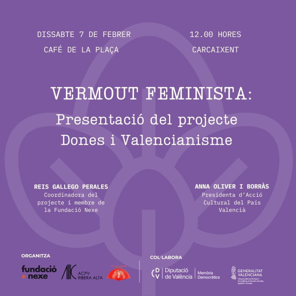 El pròxim dissabte 7 de febrer, a les 12.00 hores, el Café de la Plaça de Carcaixent acollirà un vermut feminista amb motiu de la presentació del projecte Dones i valencianisme, una iniciativa que posa el focus en el paper de les dones dins del moviment valencianista.