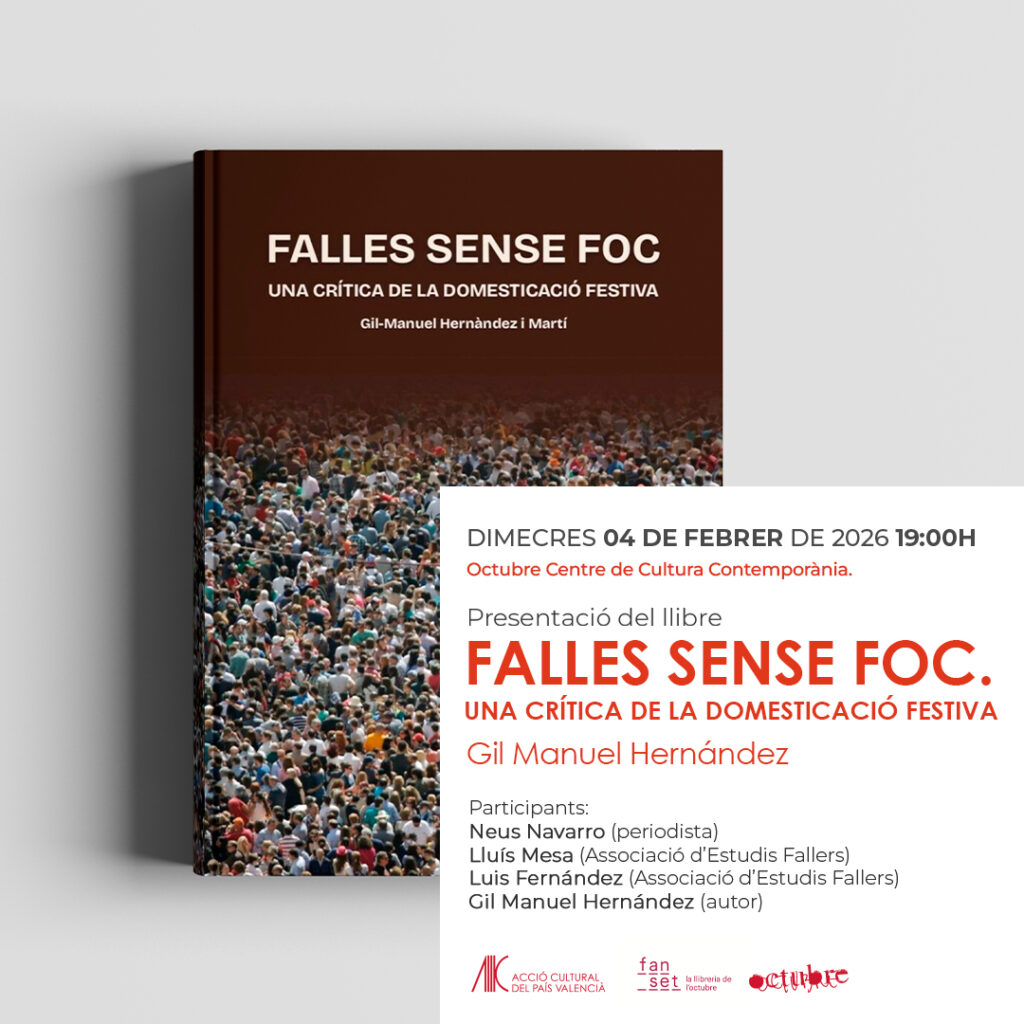 El pròxim dimecres 4 de febrer de 2026, a les 19.00 hores, el Centre de Cultura Contemporània Octubre acollirà la presentació del llibre Falles sense foc. Una crítica de la domesticació festiva, de l’autor Gil-Manuel Hernández.