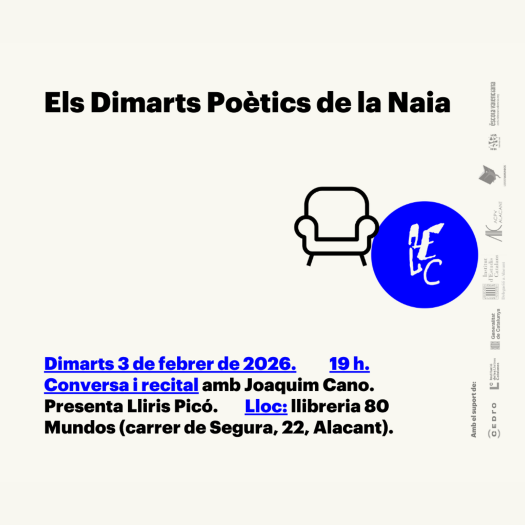 El proper dimarts 3 de febrer, la llibreria 80 Mundos d’Alacant tornarà a omplir-se de versos, veus i complicitats literàries amb la segona sessió dels Dimarts poètics de la NAIA, un cicle que vol consolidar-se com un espai estable de trobada per a la poesia en valencià a la ciutat. En aquesta ocasió, el protagonista serà el poeta Ximo Cano, una de les veus emergents més sòlides del panorama actual i guanyador del Premi Valencià Nova de poesia en valencià 2025 amb el seu celebrat poemari El deute de l’aigua.