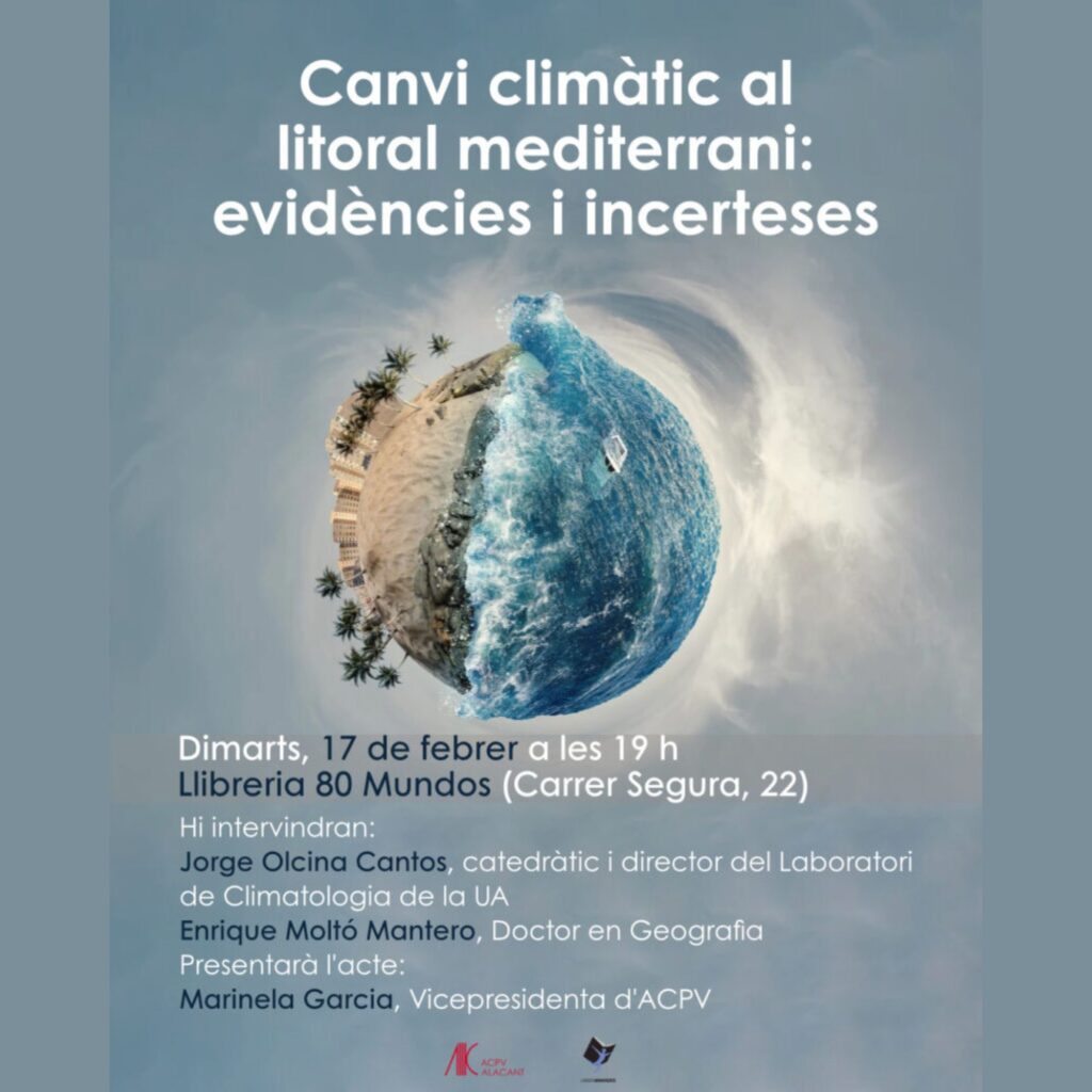 ACPV-Alacant organitza el pròxim dimarts 17 de febrer, a les 19.00 hores, una xarrada imprescindible per entendre els reptes ambientals que afronta el nostre territori: “Canvi climàtic al litoral mediterrani: evidències i incerteses”. L’acte tindrà lloc a la llibreria 80 Mundos i comptarà amb la participació de dues veus de referència en l’estudi del clima i el territori: Jorge Olcina, catedràtic de Geografia i director del Laboratori de Climatologia de la Universitat d’Alacant, i Enrique Moltó, doctor en Geografia i investigador especialitzat en dinàmiques ambientals.