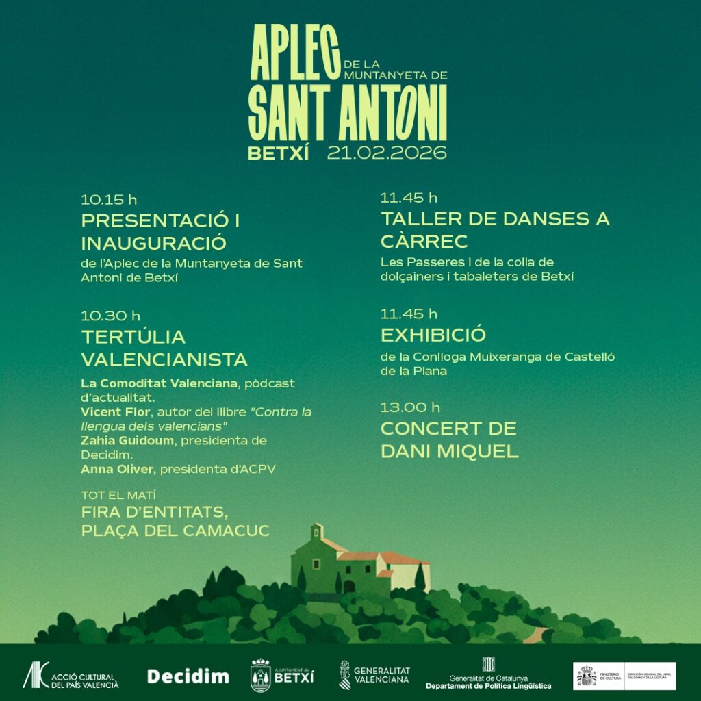 El pròxim 21 de febrer de 2026, Betxí acollirà una nova edició de l’Aplec de la Muntanyeta de Sant Antoni, una jornada de trobada, cultura popular i compromís cívic que tornarà a convertir aquest espai emblemàtic en un punt de referència del valencianisme cultural i social.