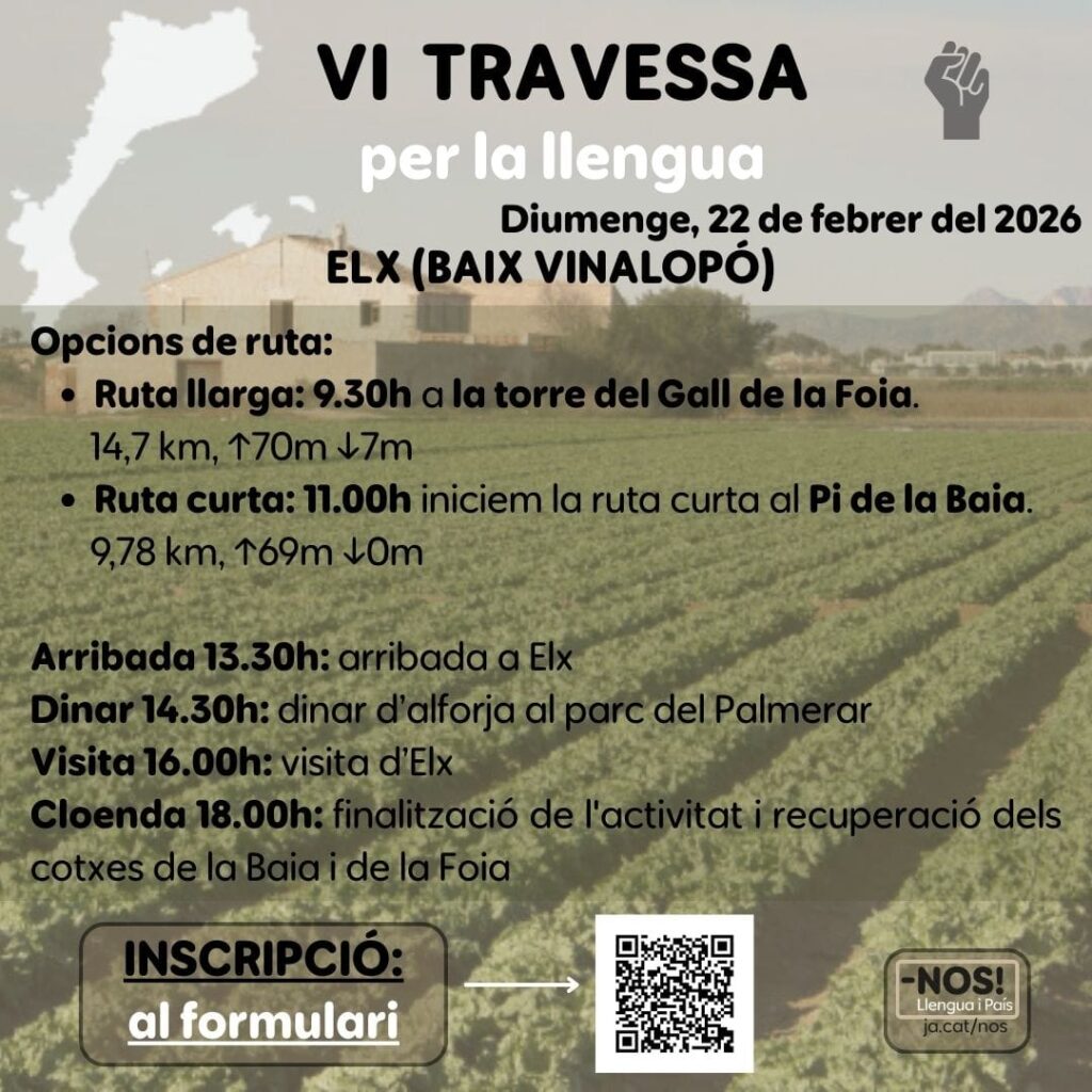 La VI Travessa per la Llengua tornarà el diumenge 22 de febrer de 2026 amb un recorregut per alguns dels paratges més emblemàtics del Baix Vinalopó. L’activitat, organitzada per diverses entitats en defensa de la llengua i el territori, proposa dues rutes senderistes que confluiran a la ciutat d’Elx, on continuarà la jornada amb activitats culturals.