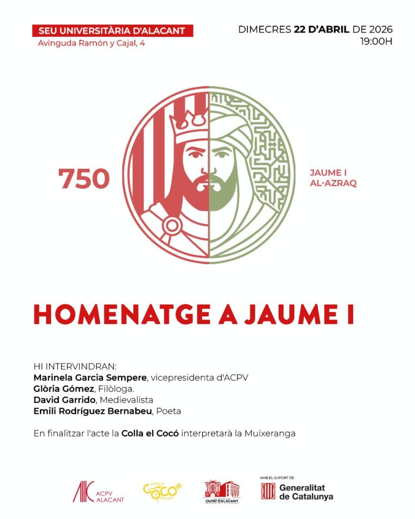 El dimecres 22 d’abril, la Seu Universitària d’Alacant acollirà un acte especialment significatiu per a la nostra comunitat cultural: l’Homenatge a Jaume I, organitzat per ACPV Alacant. Aquesta celebració vol reivindicar la figura que va marcar decisivament la història del nostre país i que continua essent un referent de construcció política, cultural i lingüística.