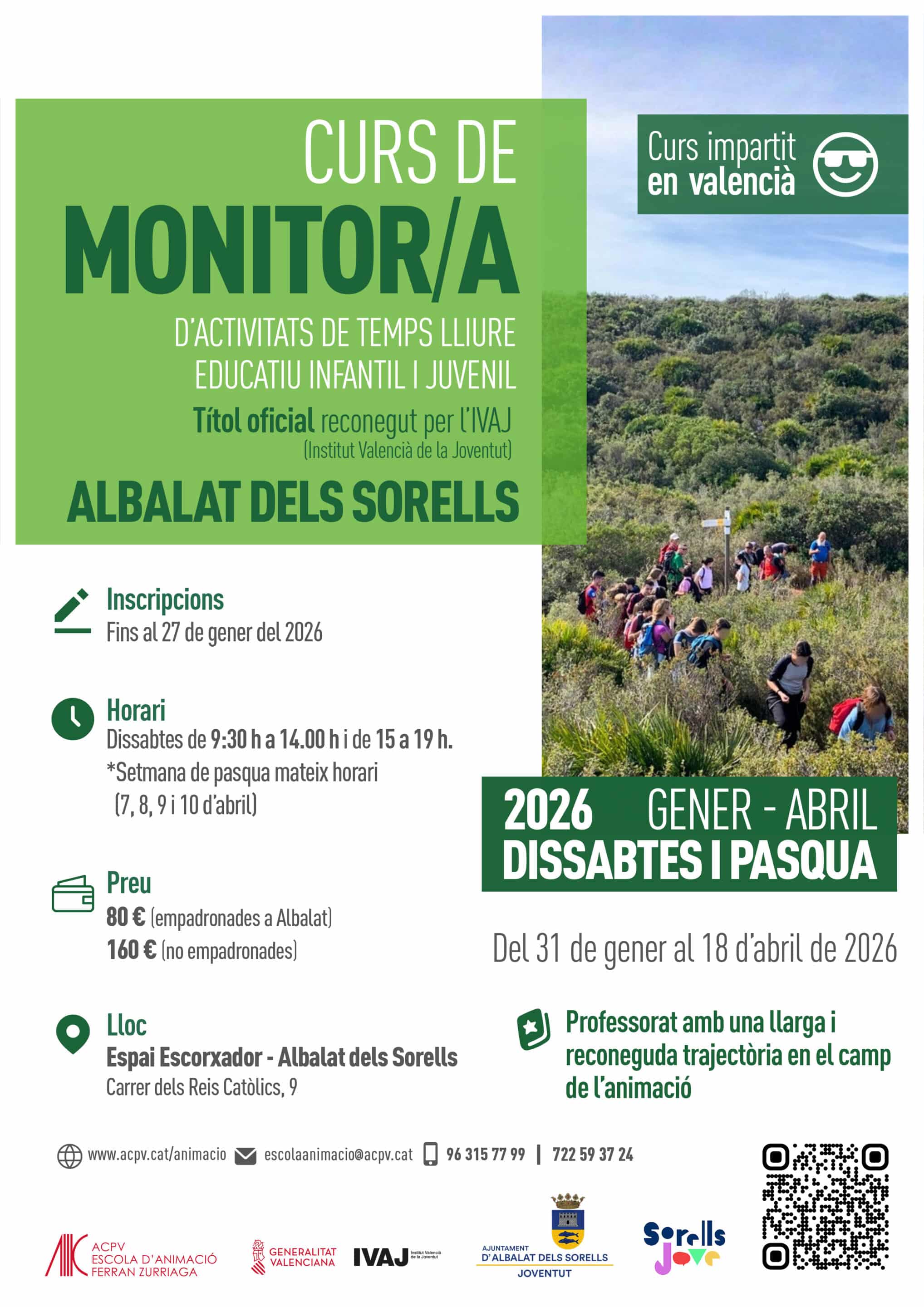 Aquest curs capacita per desenvolupar activitats educatives i d’oci en el temps lliure amb infants i joves. Permet l’obtenció del títol corresponent expedit per l’Institut Valencià de la Joventut (IVAJ-Generalitat Jove).