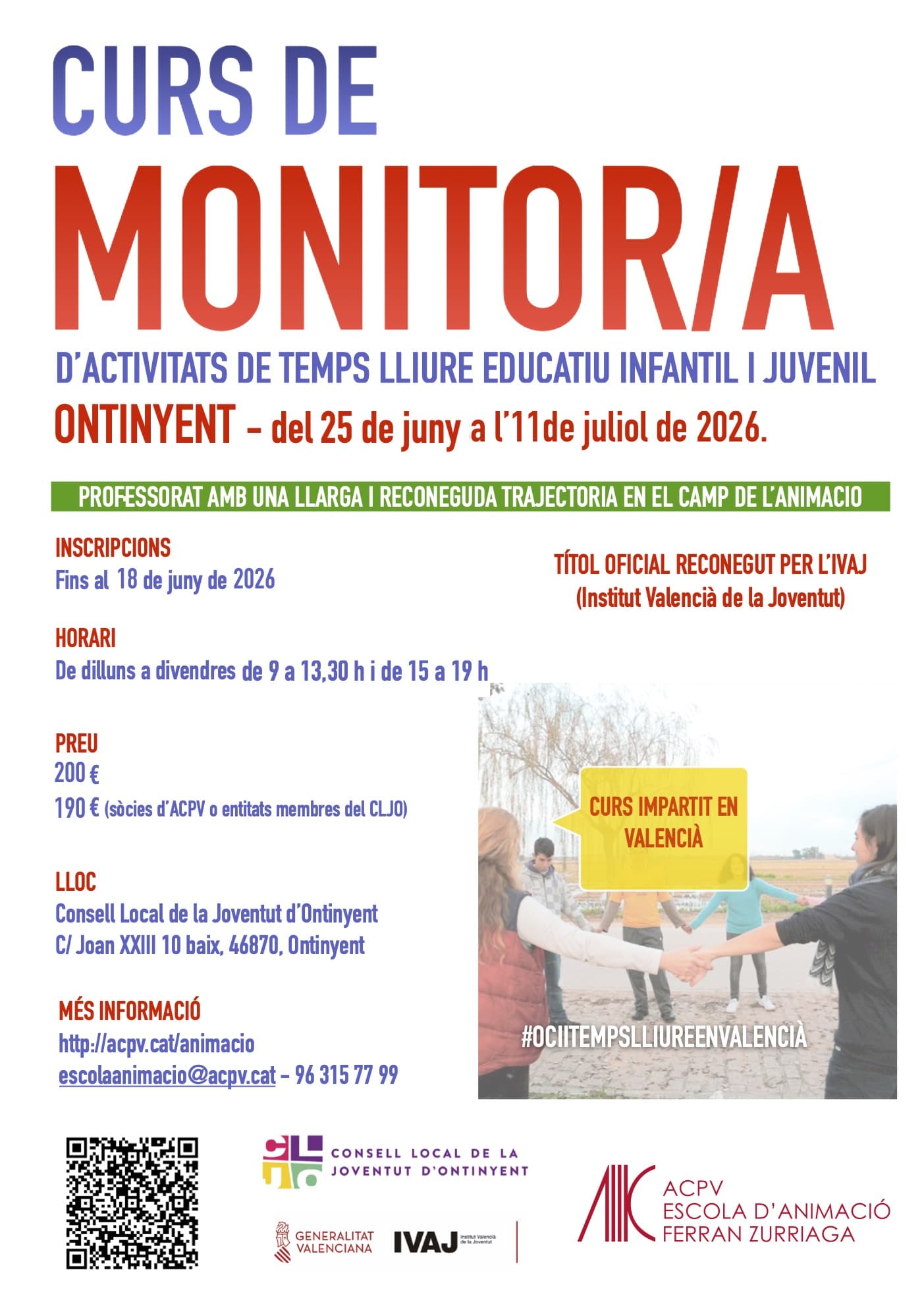 Aquest curs es dirigeix a totes aquelles persones interessades en realitzar les funcions que s’atribueixen al monitoratge d’infants i joves, mitjançant la seua participació, voluntària o remunerada, en projectes d’educació en el temps lliure.