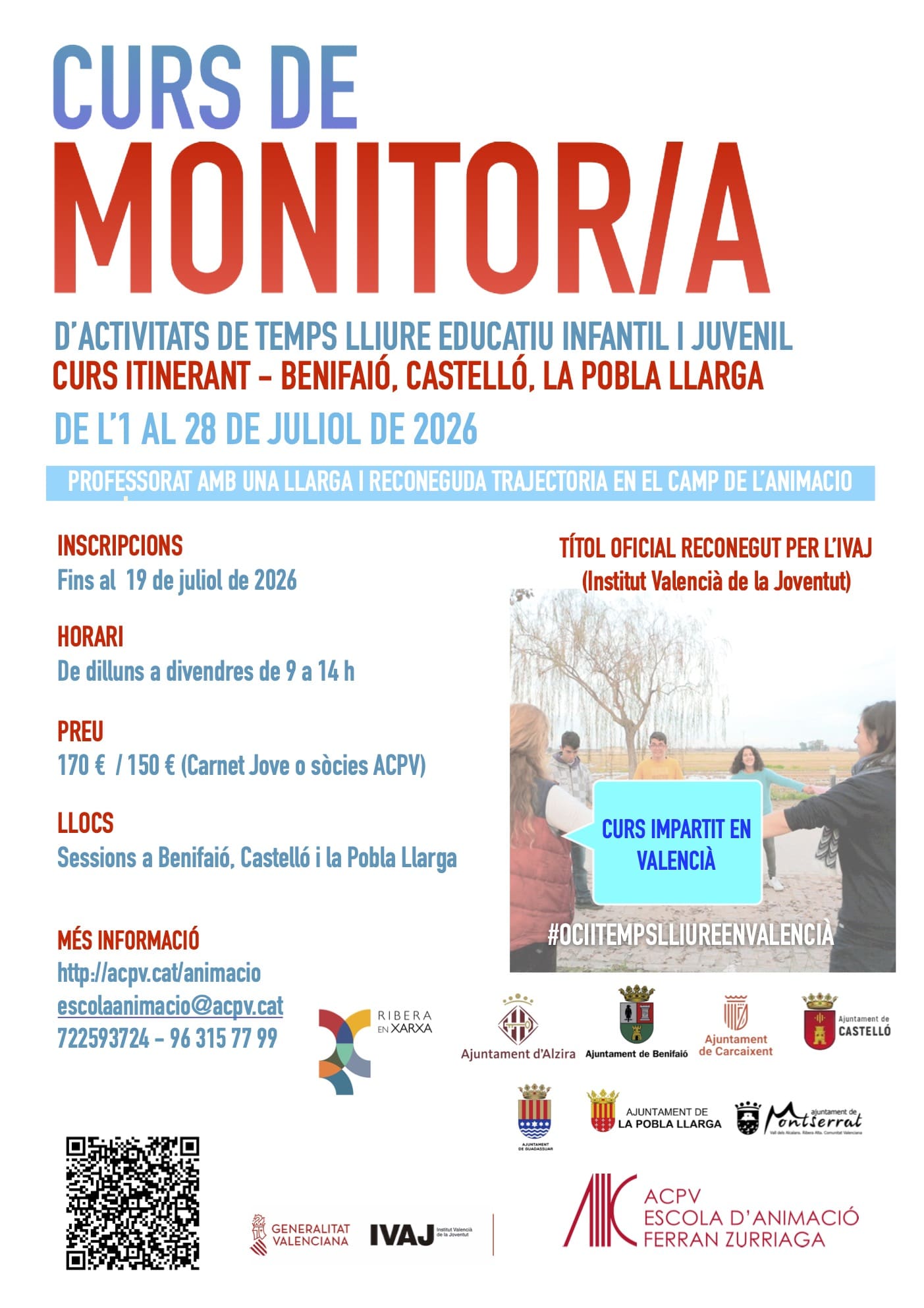 Aquest curs capacita per desenvolupar activitats educatives i d’oci en el temps lliure amb infants i joves. Permet l’obtenció del títol corresponent expedit per l’Institut Valencià de la Joventut (IVAJ-Generalitat Jove).