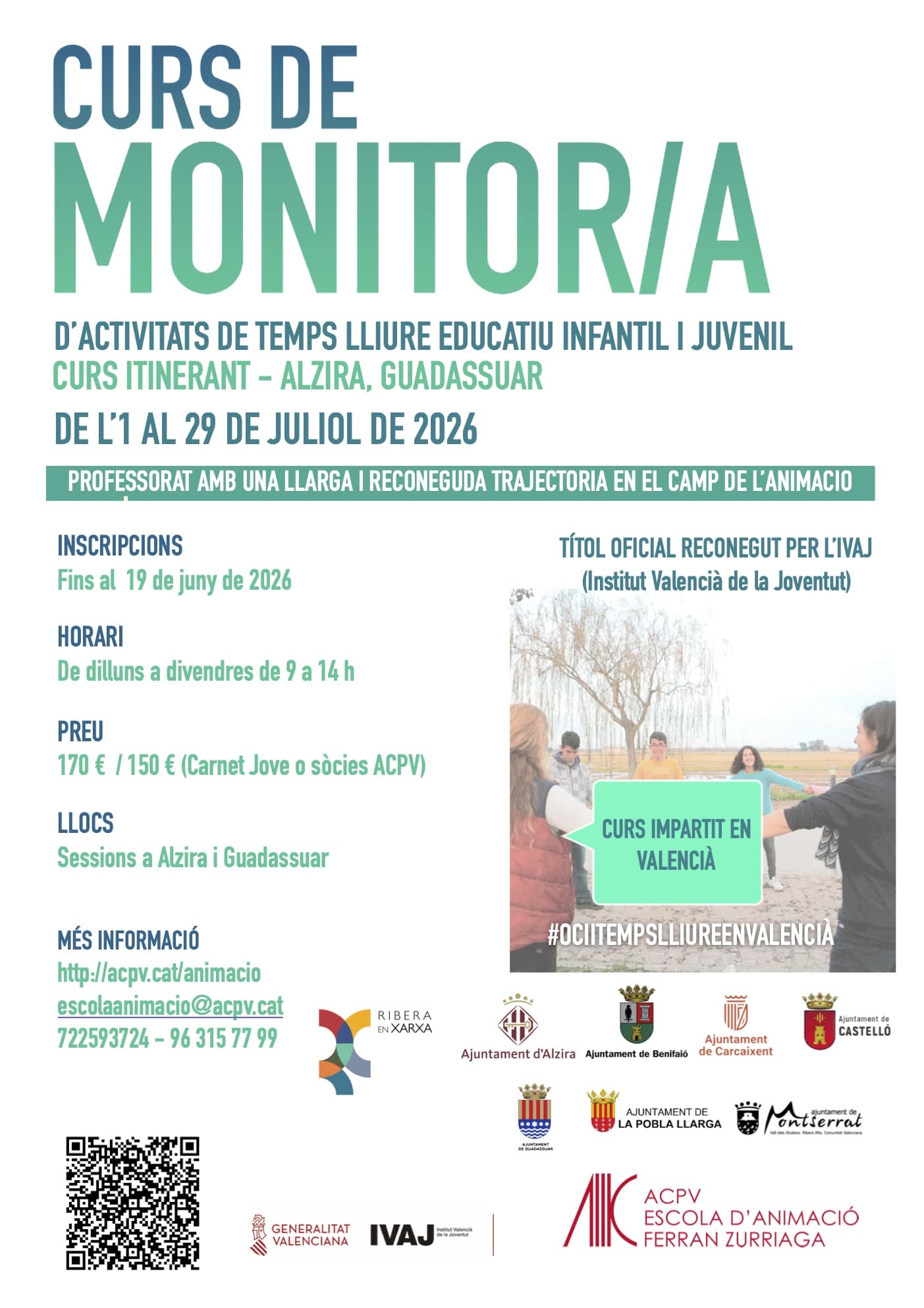 Aquest curs capacita per desenvolupar activitats educatives i d’oci en el temps lliure amb infants i joves. Permet l’obtenció del títol corresponent expedit per l’Institut Valencià de la Joventut (IVAJ-Generalitat Jove).