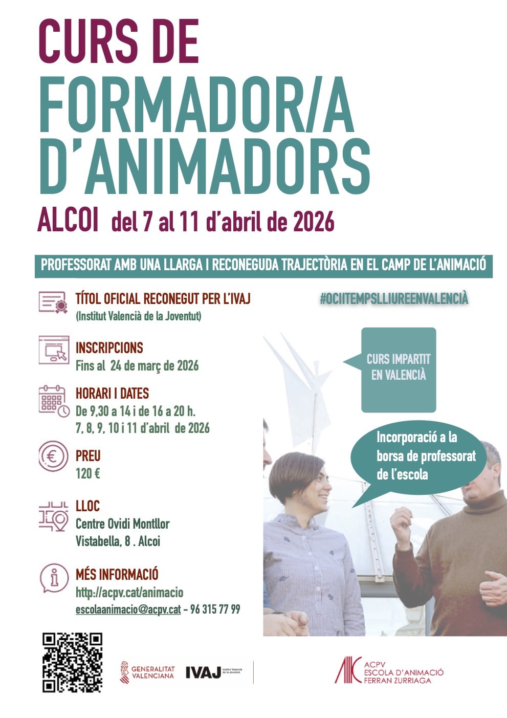 Aquest curs et capacita per programar, impartir i avaluar sessions formatives en els cursos regulats per l’IVAJ i l’obtenció del certificat corresponent expedit per l’Institut Valencià de la Joventut (IVAJ-Generalitat Jove).