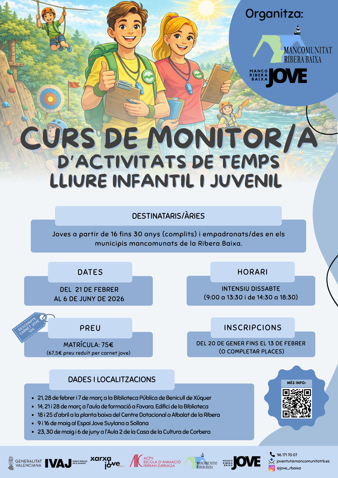 Aquest curs capacita per desenvolupar activitats educatives i d’oci en el temps lliure amb infants i joves. Permet l’obtenció del títol corresponent expedit per l’Institut Valencià de la Joventut (IVAJ-Generalitat Jove).