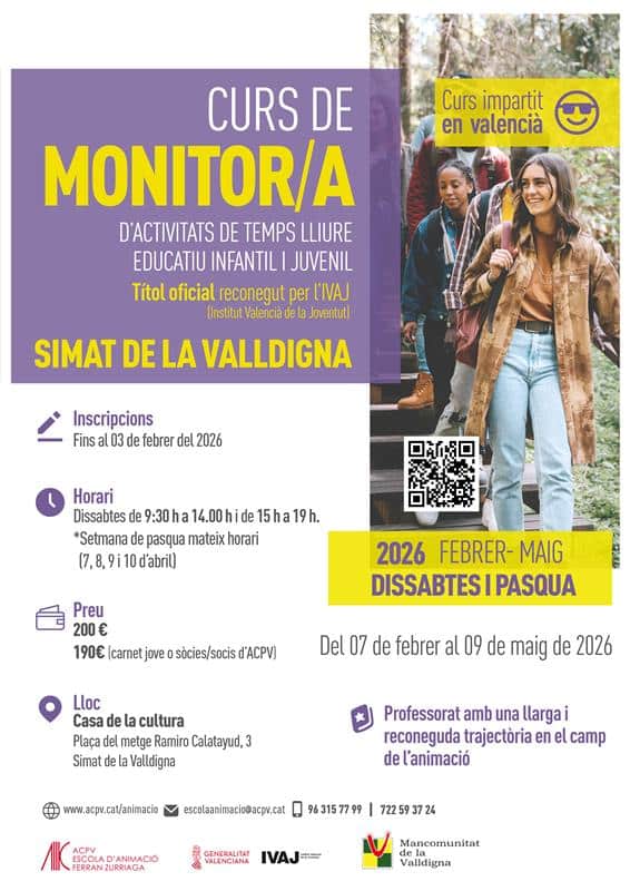 Aquest curs capacita per desenvolupar activitats educatives i d’oci en el temps lliure amb infants i joves. Permet l’obtenció del títol corresponent expedit per l’Institut Valencià de la Joventut (IVAJ-Generalitat Jove). L’edat mínima per a fer el curs són 16 anys el dia que comença el curs.