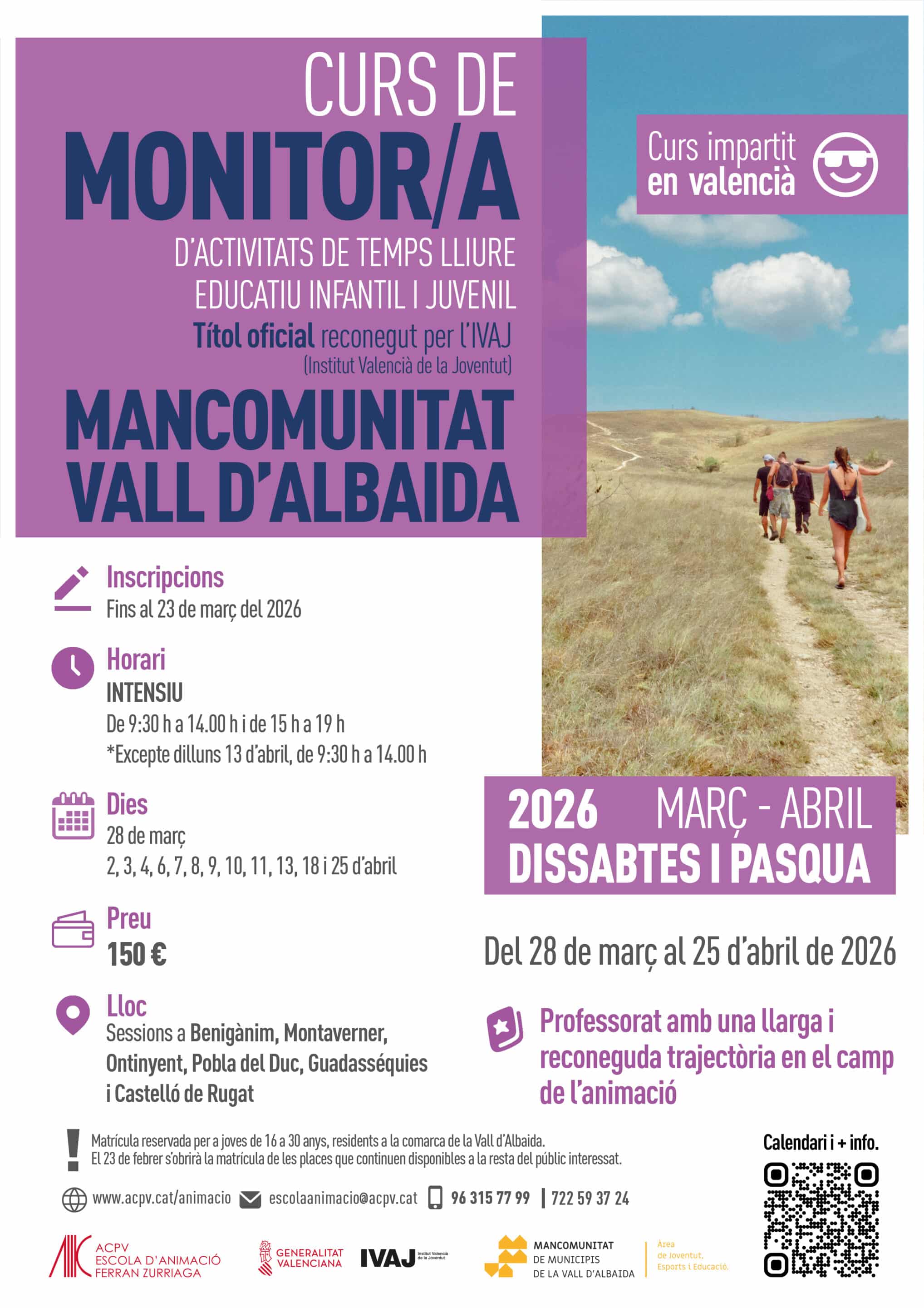 Aquest curs capacita per desenvolupar activitats educatives i d’oci en el temps lliure amb infants i joves. Permet l’obtenció del títol corresponent expedit per l’Institut Valencià de la Joventut (IVAJ-Generalitat Jove).
