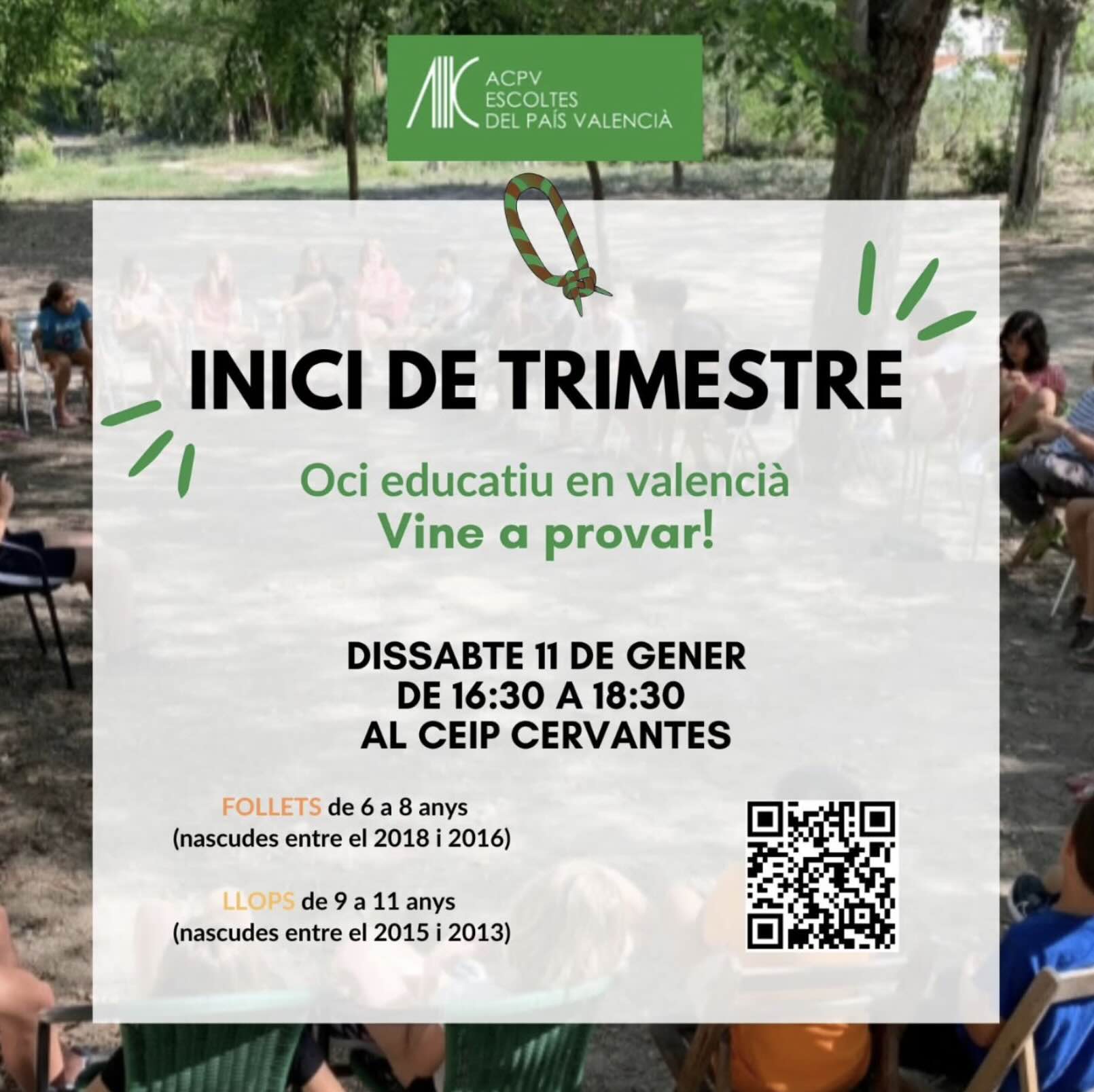 Aquest dissabte 11 de gener comencem el 2n trimestre! 👏🏻🥳 Ho farem totes les unitats juntes al 📍CEIP Cervantes de ⌚ 16.30 h a 18.30 h. Feu arribar aquesta informació a qualsevol persona que estiga interessada en formar part d’Escoltes. Les persones interessades en inscriure’s, poden vindre a provar! 🫂 Saber més