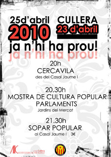 A Cullera, organitzat per Acció Cultural, es realitzà una cercavila des del Casal Jaume I de Cullera fins al mercat on la Colla de dolçainers, tabaleters i dansaes de la Falla el Raconet de Cullera va fer una mostra de cultura popular que acabà amb la lectura d’un manifest recordant la data del 25 d’Abril a càrrec de Marc Juan, d’Acció Cultural. En acabar es va fer un sopar popular.