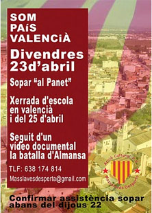 MassalavésEl passat 23 d'abril la delegació d'ACPV a Massalavés organitzà una nit en commemoració al 25 d'Abril. L'acte va constar d'un sopar i una xerrada sobre el 25 d'Abril i la Batalla d'Almansa tot seguit es va passar a la projecció del documental realitzat per Infotv Almansa 1707: De la revolta a la repressió. --------------------------------------------------------------------------------------- Divendres 23 d’abrilA les 22’00 hores Sopar "al Panet" Més informació: massalavesdesperta@gmail.com