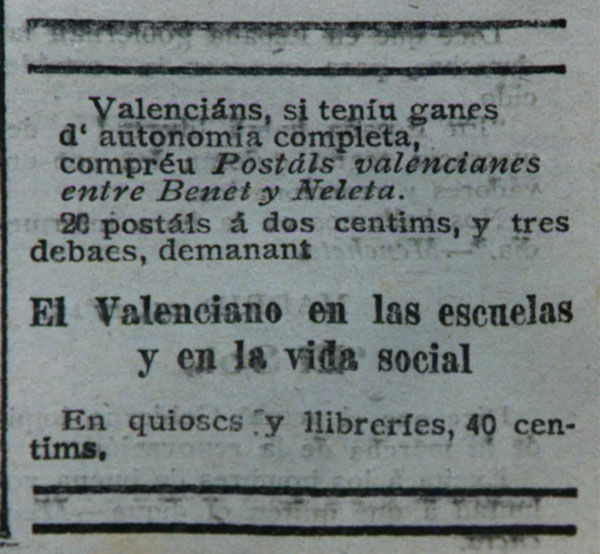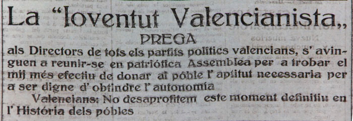 Tot i que la Mancomunitat Valenciana mai no arriba a constituir-se, la Joventut Valencianista tampoc no s’atura en l’objectiu d’eixamplar les bases del valencianisme i l’autonomisme. El 14 de novembre de 1918, el diari La Correspondencia de Valencia publica en portada la Declaració Valencianista, amb les vuit bases valencianistes. Cadascuna d’aquestes bases és glossada en els dies posteriors per diferents membres de les organitzacions signatàries en sengles articles. |