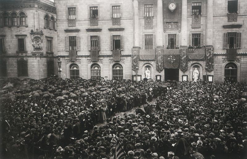 Sortida de l’Ajuntament de Barcelona de la comitiva que portava les adhesions del plebiscit municipal, en favor de l’autonomia de Catalunya, al president de la Mancomunitat (16 de novembre de 1918) |